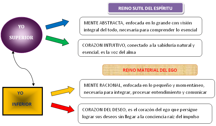 Luego del diálogo que mantuve con Lama Geshe Tenzing, en una entrevista para Radio Serenidad, tuve una nueva perspectiva para entender el proceso por el cual los seres humanos logramos una comprensión integral de algo. El Lama me dio a entender que necesitamos entender las cosas primero con la razón para luego llevarlas al corazón y, mediante la práctica, lograr la integración de pensamiento y corazón. Según él, la conciencia abarca tanto el pensamiento como el sentir del corazón. La manera en que lo expresó me permitió reorganizar mis pensamientos alrededor del tema de la mente racional, la misma que he expuesto antes que es necesaria para nuestro entendimiento en el nivel lógico, pero que no podemos quedarnos ahí puesto que lo que abarca es puntual y, por eso, necesitamos abrirnos a la mente abstracta. Durante el programa Reflexiones, pude expresar esta idea con mucha claridad al hacer asociaciones desde una perspectiva que puede resultar más clara para algunas personas. He asociado la mente racional con el ego, en la medida que seamos esclavos de los pensamientos, y la mente abstracta la he asociado con el alma asumiendo, obviamente, que el alma representa el ser sabio y esencial en nosotros. La mente abstracta y el corazón intuitivo son las herramientas del alma así como la mente racional y el corazón del deseo son las herramientas del ego. El ego representa nuestro yo inferior y el alma representa nuestro Yo Superior. Generalmente, vivimos divididos y separados entre el yo inferior y el Yo Superior. En el siguiente diagrama intento representar, de forma visual, este concepto. Usando las herramientas de las que disponemos los humanos, necesitamos encontrar la manera de alinear el yo inferior con el Yo Superior, el ego con el Alma, la mente racional con la mente abstracta y el corazón del deseo con el corazón intuitivo. Esa es una tarea que requiere nuestra total atención, disciplina y persistencia.