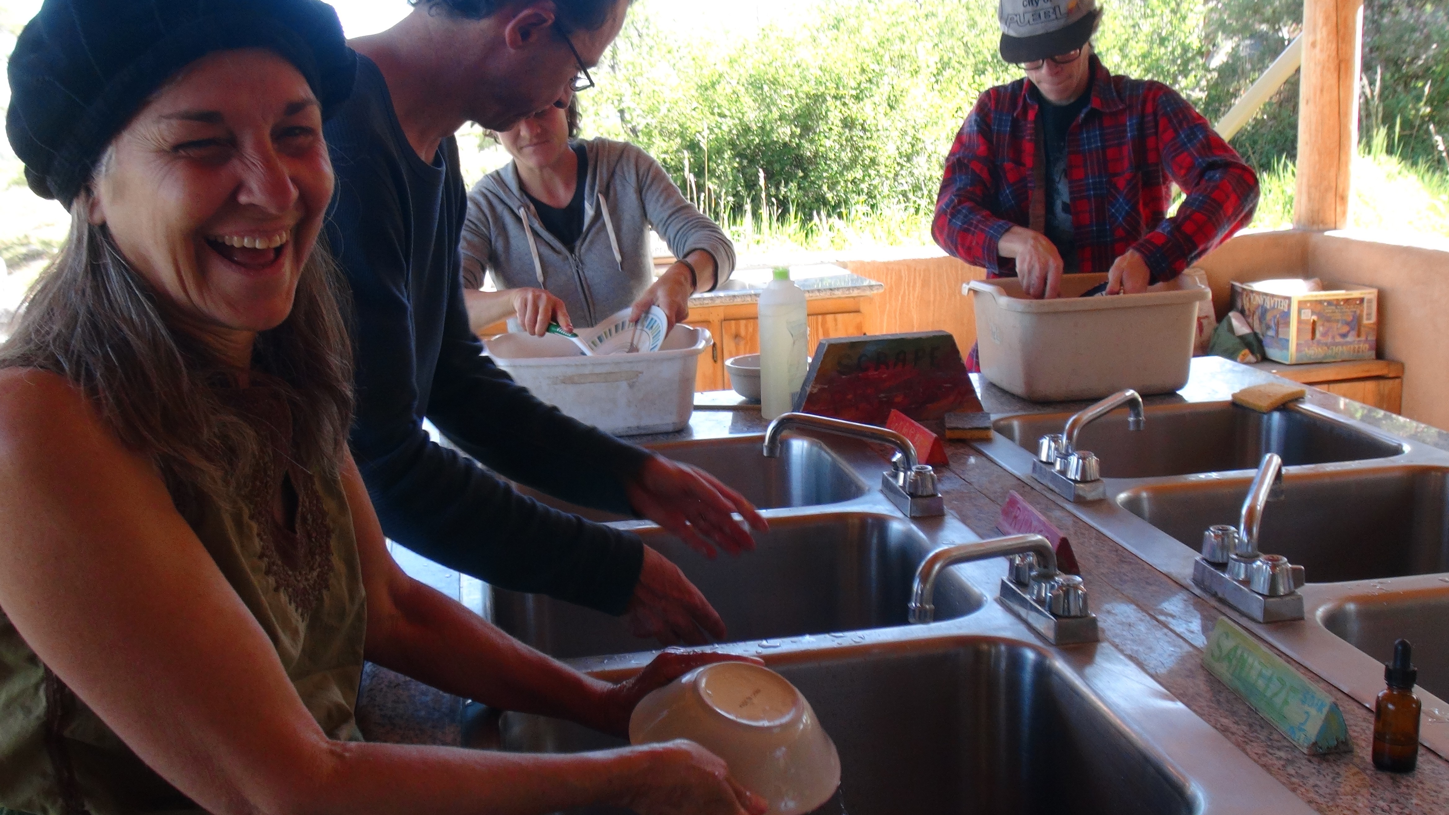 on 22 asistentes, de todas las edades, ávidos de aprender. Antes de cada comida se hacía un círculo alrededor de los alimentos para saber cuál sería el menú y hacer oraciones de agradecimiento. El sistema de lavado de platos era muy práctico. En vista de que había que usar solo lo necesario, habían 3 lavabos grandes y profundos. En el primero se fregaba los platos, en el segundo se enjuagaban y en el tercero se los dejaba reposar con algún desinfectante natural (gotas de aromaterapia). Cada quien tenía que alzar los platos de otra persona y dejarlos en un lugar para que se sequen. Muy comunitario el principio. El ambiente era muy tranquilo. ¡Qué alivio es dejar un ordenador, un libro o un móvil en cualquier lugar sin el temor de que desaparezca! Habían dos duchas para todos así que las bañadas se daban cuando había como. Vivimos bien empolvados, prácticamente, todo el tiempo porque es una zona muy seca. La comida era totalmente vegetariana y solo recuerdo el día en que nos dieron sushi vegetariano y unos wraps de vegetales que estuvieron deliciosos. Taos estaba a 25 minutos, así que una que otra vez nos escapamos al pueblo. El grupo de compañeros fue muy bueno, existió mucha cohesión y resonancia.